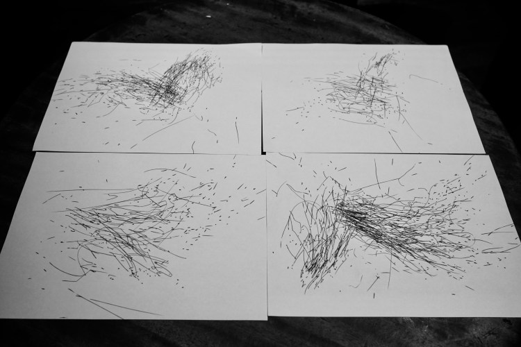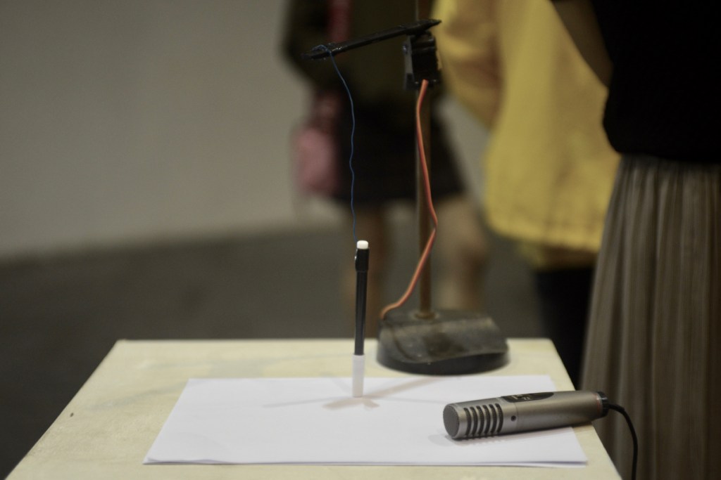 “Drawn conversation accompanied by sunflower seeds” – a participatory performance/installation/talk by Siedl/Cao. We talk to people and let this talk being “recorded” on paper by a drawing machine that draws according to human voice. The sound of cracking sunflower seeds accompanies the conversation the whole time. It acts as a hyphen which connect our words together, as absorber of awkwardness, as fillings between the streams of thoughts, as a path to meditation or contemplation.
