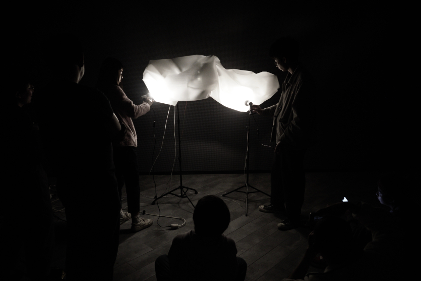 The audience who use two spotlights with switch influences the light intensity in the space, thus “dial” through channels with their spotlights.