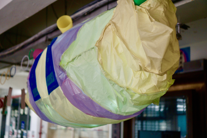 This sound installation takes the shape of a voyager made up of designated plastic trash bags used within Taipei area. The voyager is “traveling” in space with the sound of radio short waves, with the musical garbage truck tune – “Mainden’s prayer” by Tekla Bądarzewska-Baranowska, and with ideas from the Taiping Elementary pupils written on cardboards of how to reinvent plastic for the future.