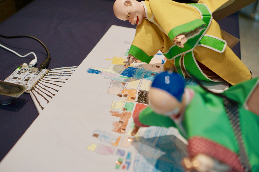 To interact, put your hand into the puppets, use the puppets’ hand to touch the golden spots on the map.